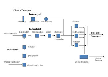 It comprises a physical process separate the large objects from the water. Here the sand and stones present in the water collect in the bottom of the chamber and also allows all the organic precipitate to settle down while oils, fats, grease float on the top of the water. Also these are a biological system where the oxygen is allowed to mix with the water and thus microorganisms present in the water are eliminated. Finally, a chemical process of water recycling, the water is passed through the chlorine chambers. The chlorine kills the microorganisms which were not even captured in the above processing.